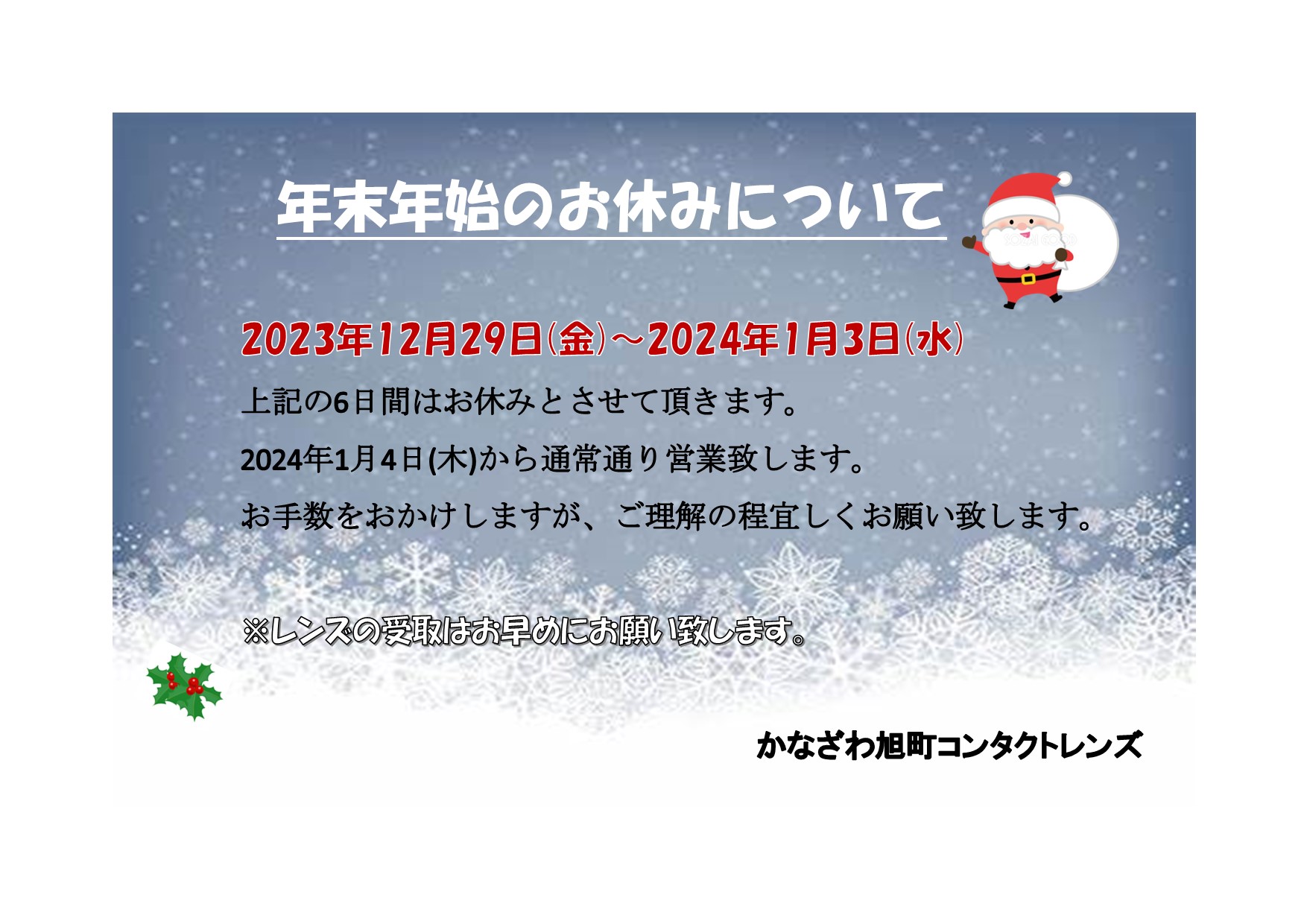 当店と隣接眼科は2023年12月29日(金)~2024年1月3日(水)まで年末年始休業となります。